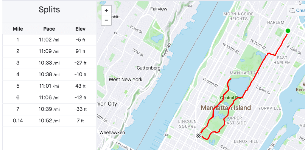 November 1 would have been the date of the 50th New York City Marathon, so I decided to run a bit of the course for fun in my 70 minute planned long run. Of course the rain began by mile 1, so I put on my Asics Stormchaser jacket and popped the hood (should have brought a hat to keep the rain off my glasses). I’m pretty happy with my splits, all things considered, though the faster times were due to going downhill. The last mile was an absolute slog. I overshot my turnaround point and went up to 90th St then back down to Columbus Circle. My form was falling apart (once I accidentally kick my own ankles, I know it’s getting bad). However there were supporters with cowbells cheering us on and some folks present for their virtual marathoners near the finish line. Even though the weather wasn’t ideal, it was nice to see so many supporters and see so many other runners.
